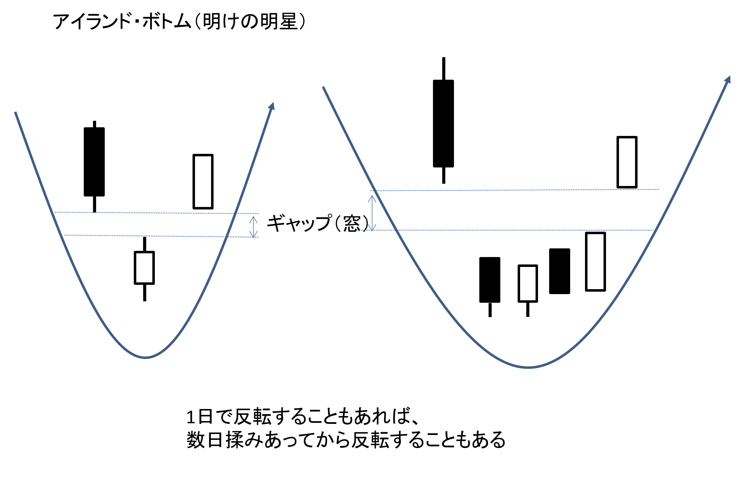 「明けの明星」(三川明けの明星)大陰線のあとに空(マド)を開けて小陰線、もしくは十字線を付けてから再び空(マド)を開けてから大陽線となる三つの線。買いの暗示。