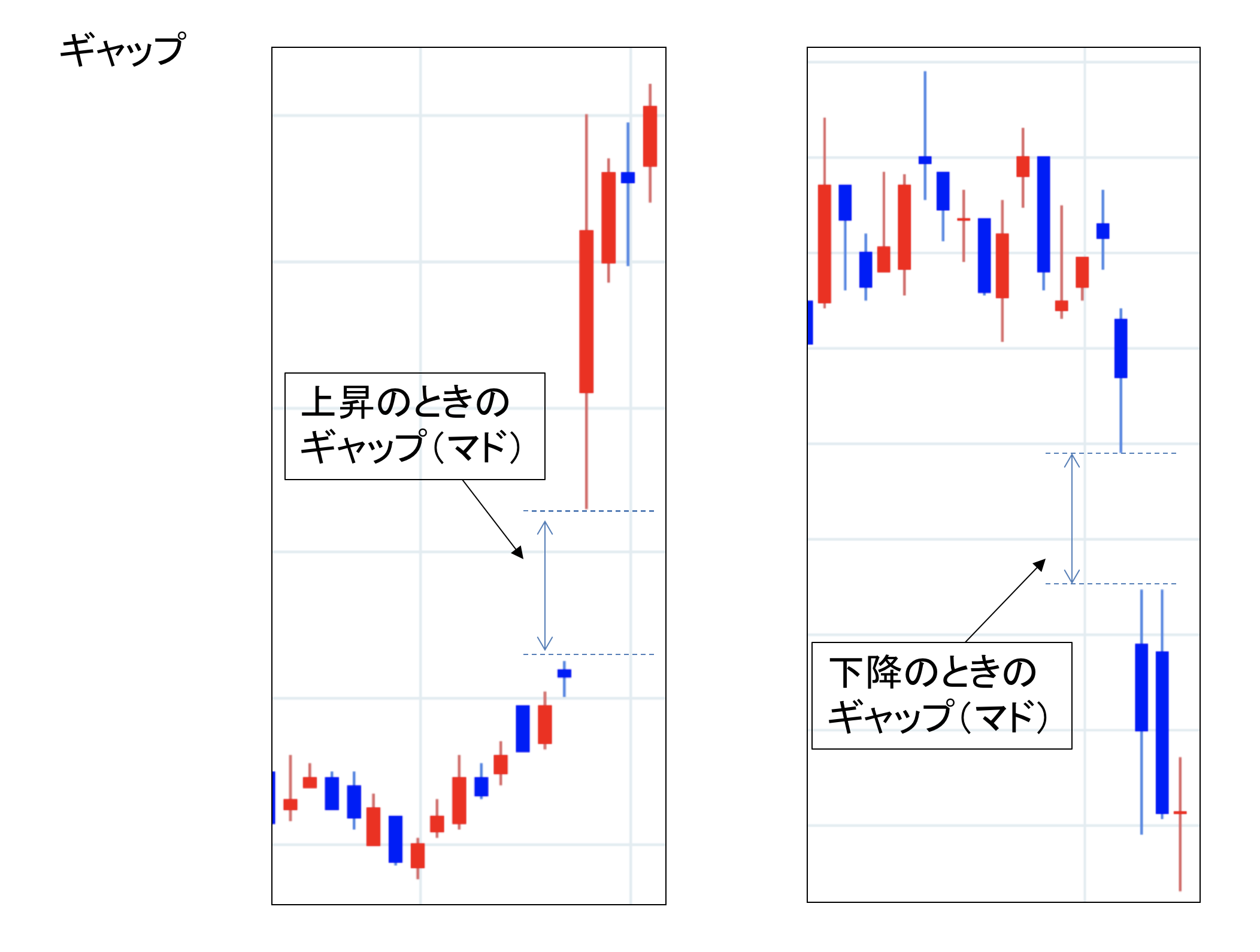 (窓、マド)価格の急激な変化によって生じる価格構造上の不連続性。通常市場が閉鎖中に新しい情報が発表されたときに生じるケースが多い。