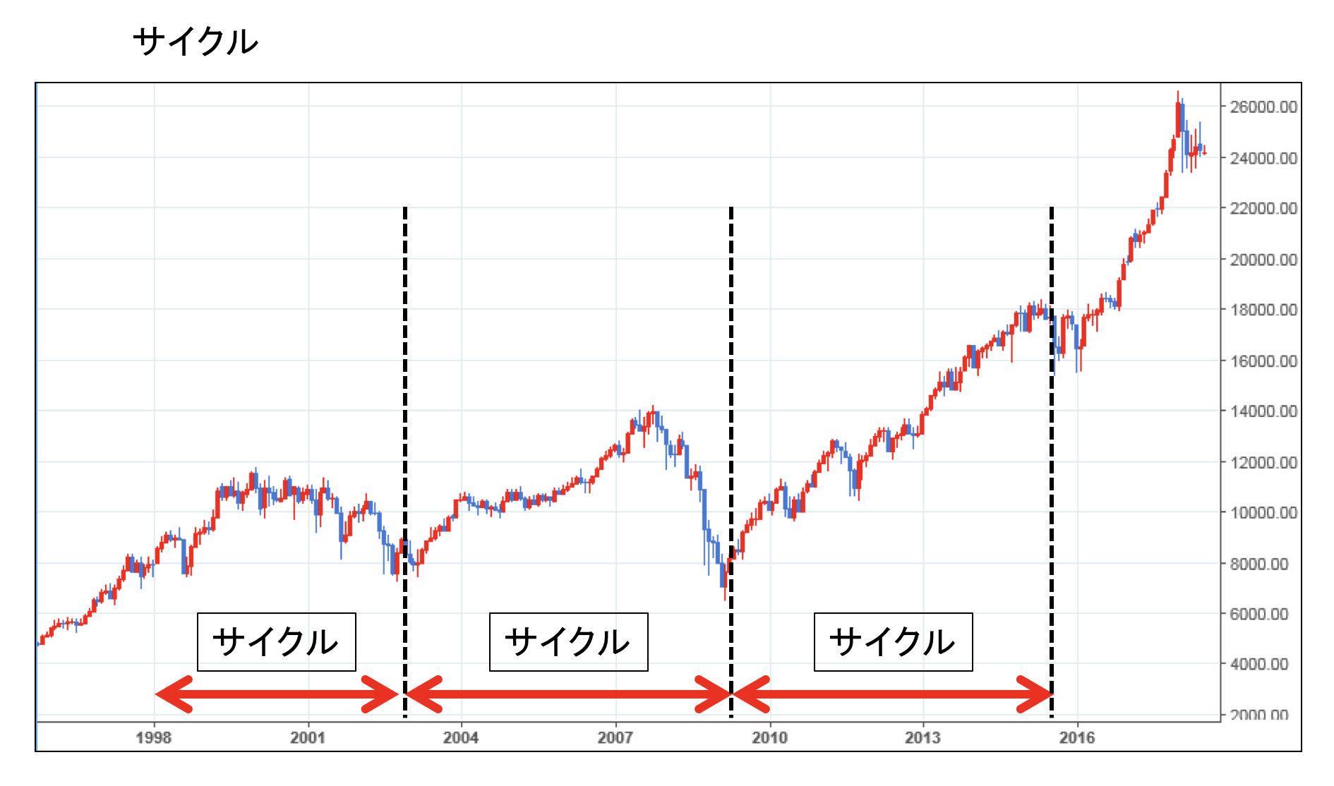 定期的に発生する出来事。キチンサイクルや4年サイクルなど。変動する周期。