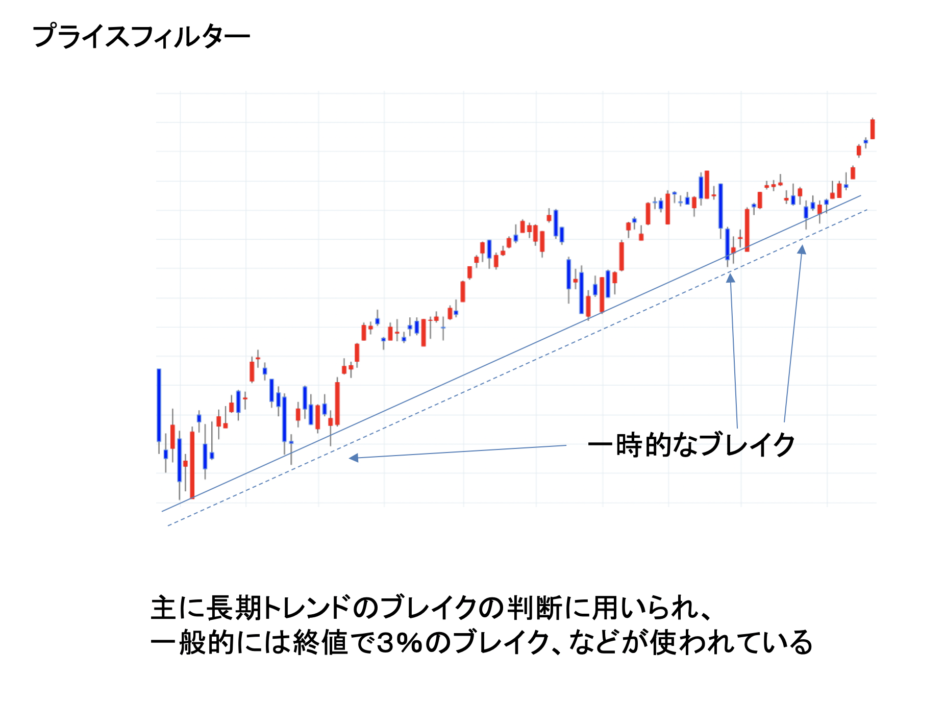 プライスフィルター 2018.01.04 ふ プライスフィルター特定のプライスの変動幅あるいは変動率で、ブレイクの有無を決める方法。短期的なノイズ(変則的な動き)を減少させて、パターンをはっきりさせることを目的とした数学的ツール。