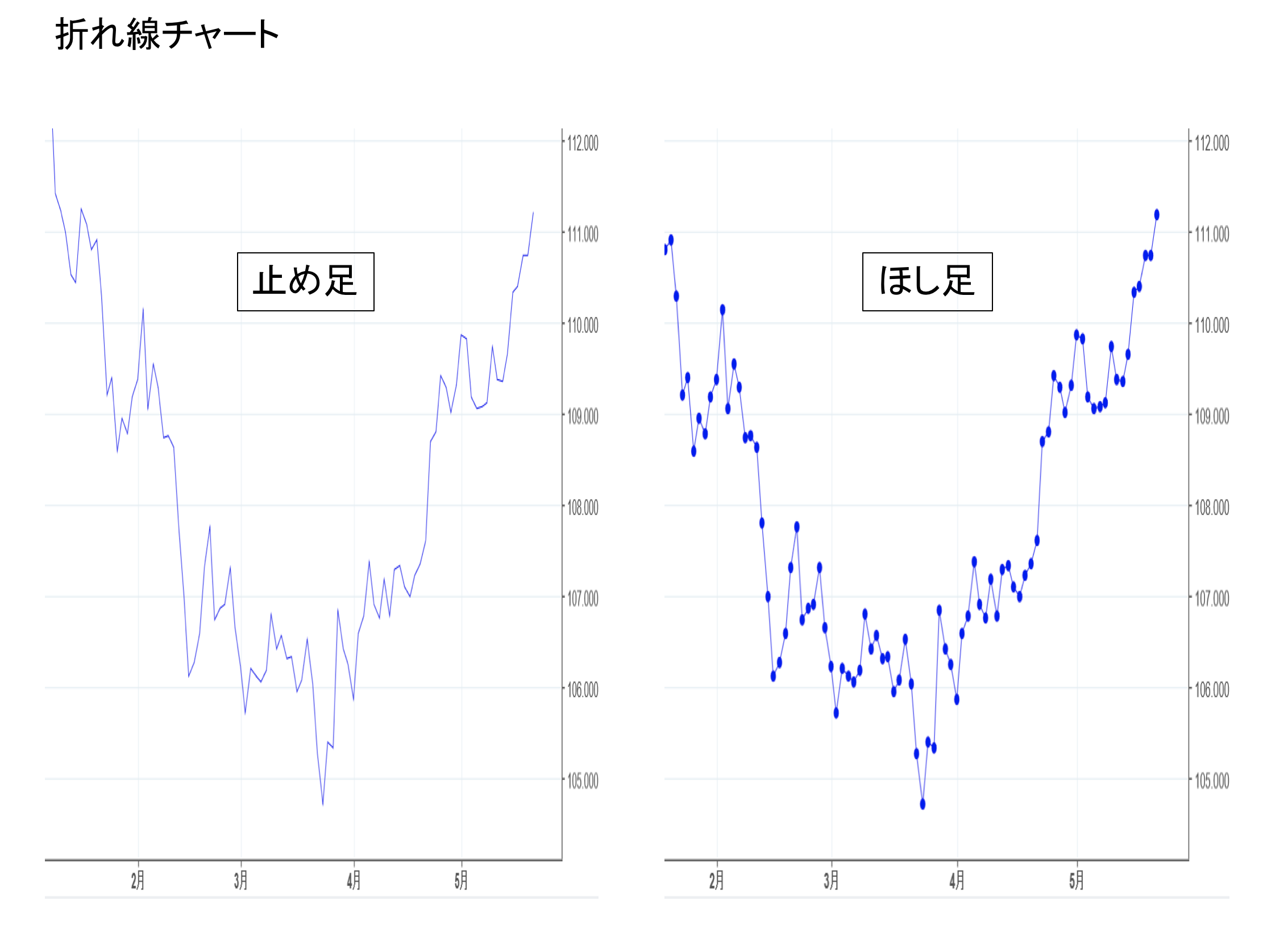 折れ線チャート(大引足)終値だけを点で表し、点と点を線で結んでいくシンプルなチャート。「とめ足」「ほし足」多数のデータが提示されていたり、あるいはデータをひとつの点として表すことができる場合には便利である。