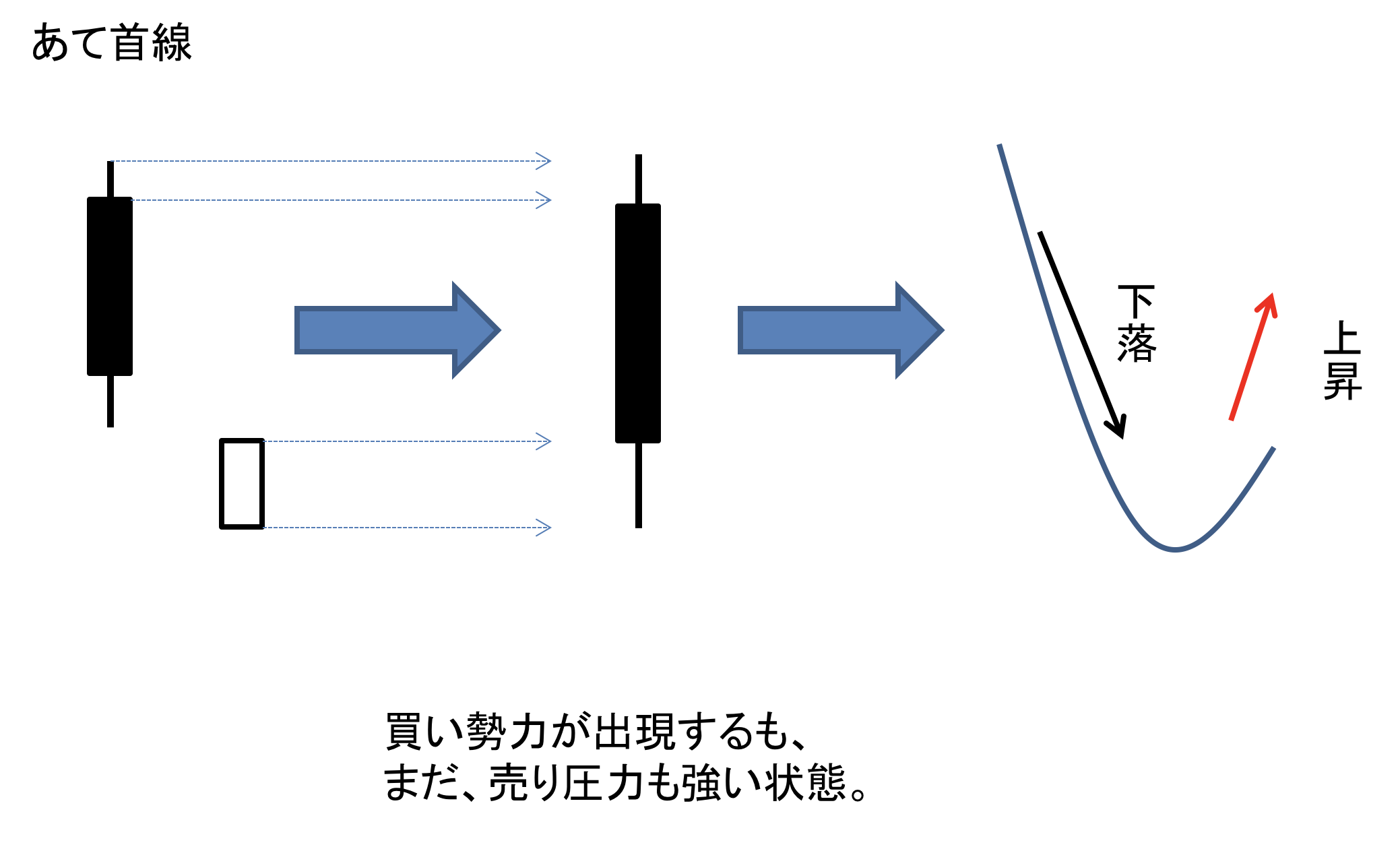 (あて首線)当日の陽線が前日の陰線の終値より下から始まり、前日の陰線の中心まで戻らないローソク足の組み合わせ。