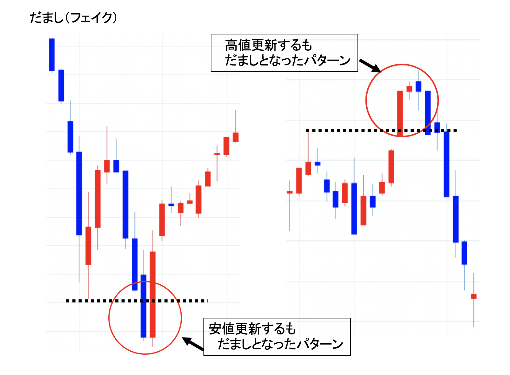 フェイク。チャートで売り、または買いのシグナルが出るも思惑に反して反対に動くこと。