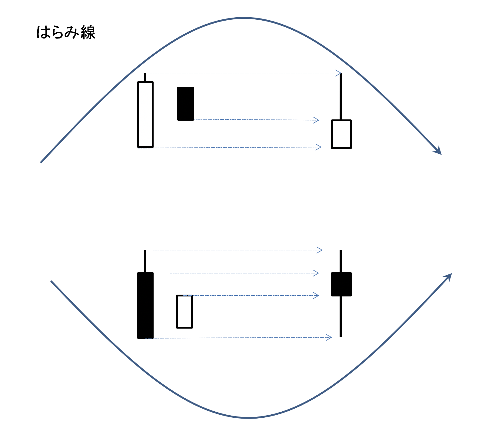 はらみ線ローソク足の組み合わせ。前日の陰線(もしくは陽線)の値幅内において陽線(もしくは陰線)が出現する型のこと。 この記事を読んだ方には次の記事もオススメです! 用語解説32 「包み線・はらみ線」 動画ではらみ線について解説しています!