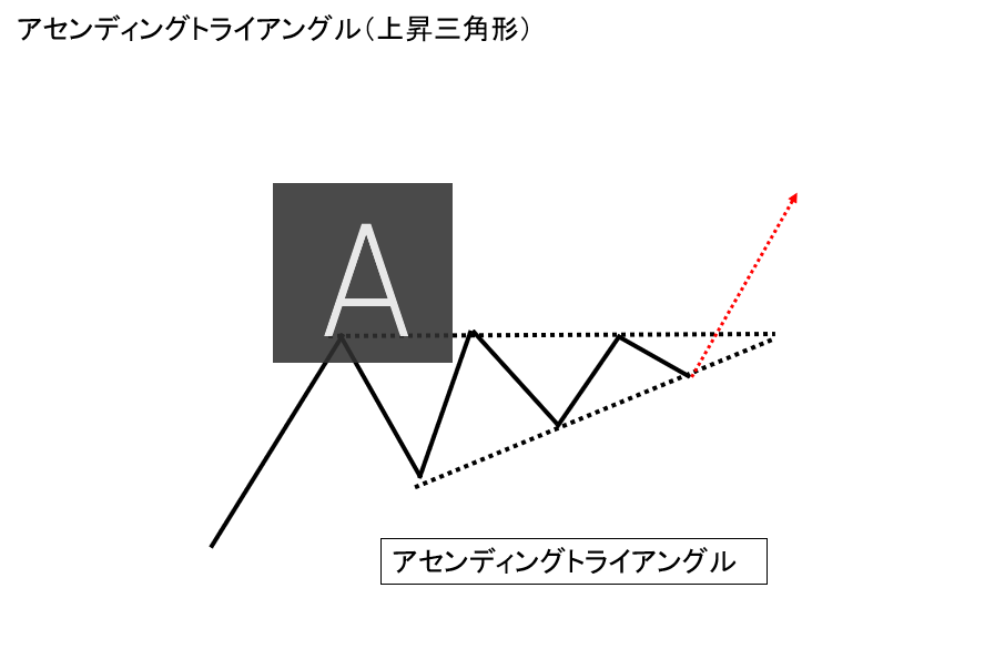 「アセンディングトライアングル」(上昇三角形)保ち合いのチャートパターン。