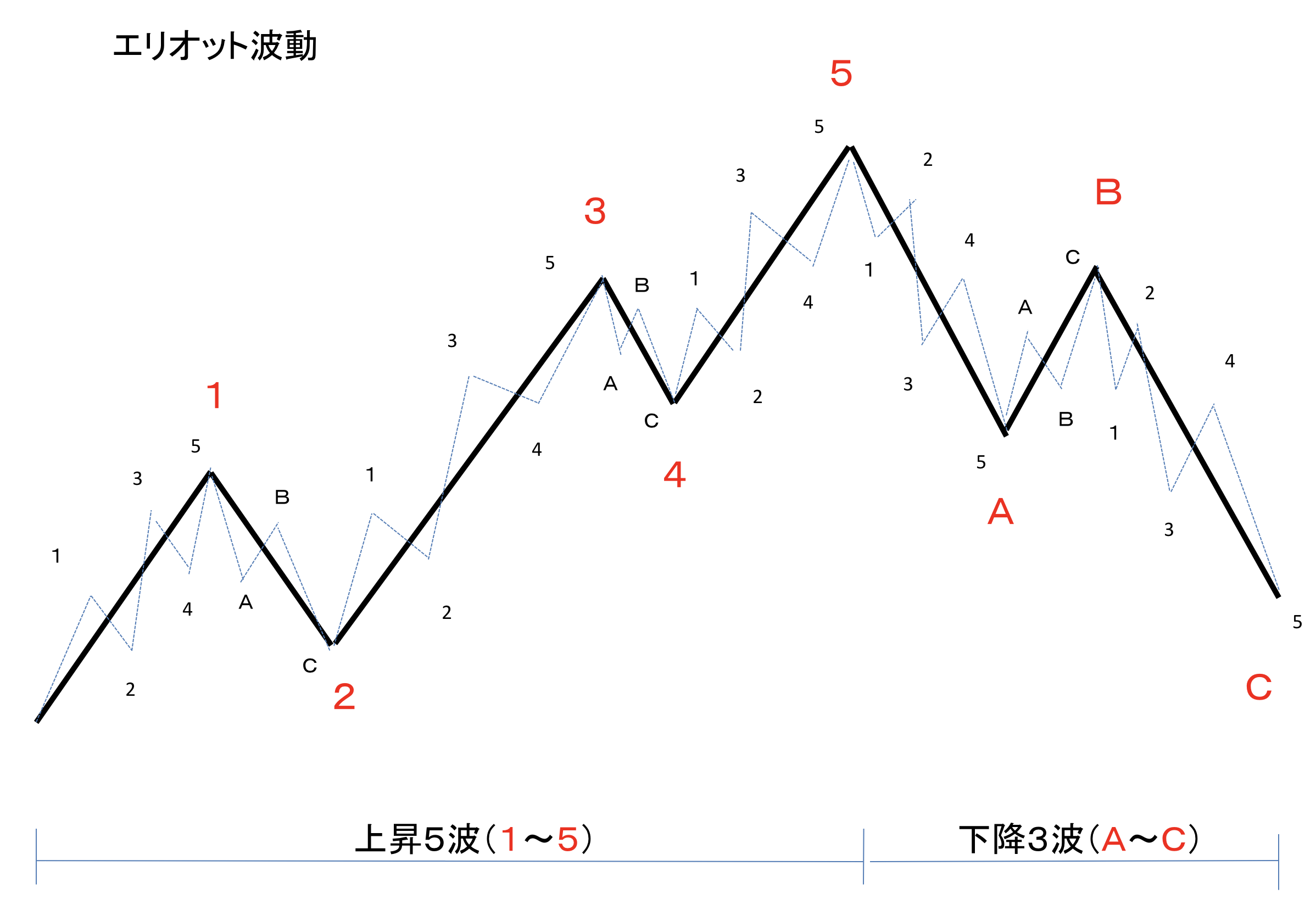 エリオット波動R.N.エリオットが説いた、すべての相場の動きは主要な5つの波動と3つの修正波からなる秩序正しい展開を見せるという論理。ひとつの大きな波は、上昇5波修正3波という同じパターンの小さな波に分解できるというのである。