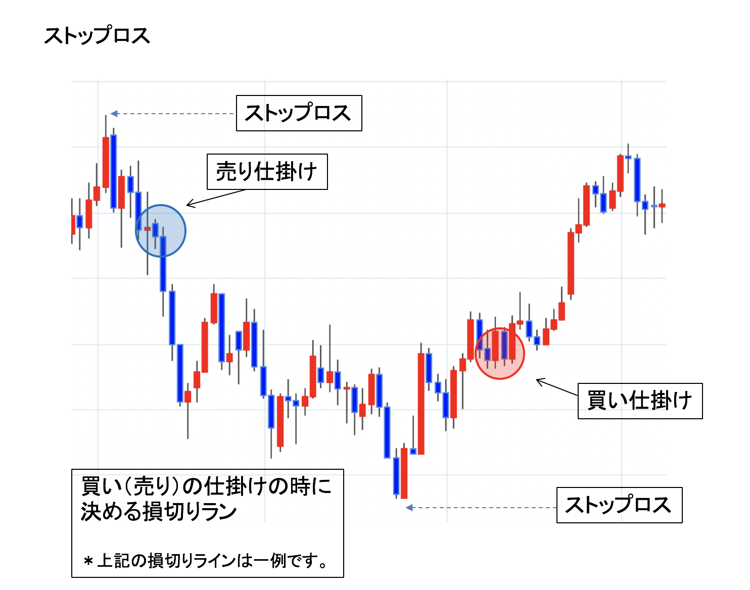 トレードにおいて損失を小さくするために、あらかじめ決められた価格のポイント。損切ポイント。