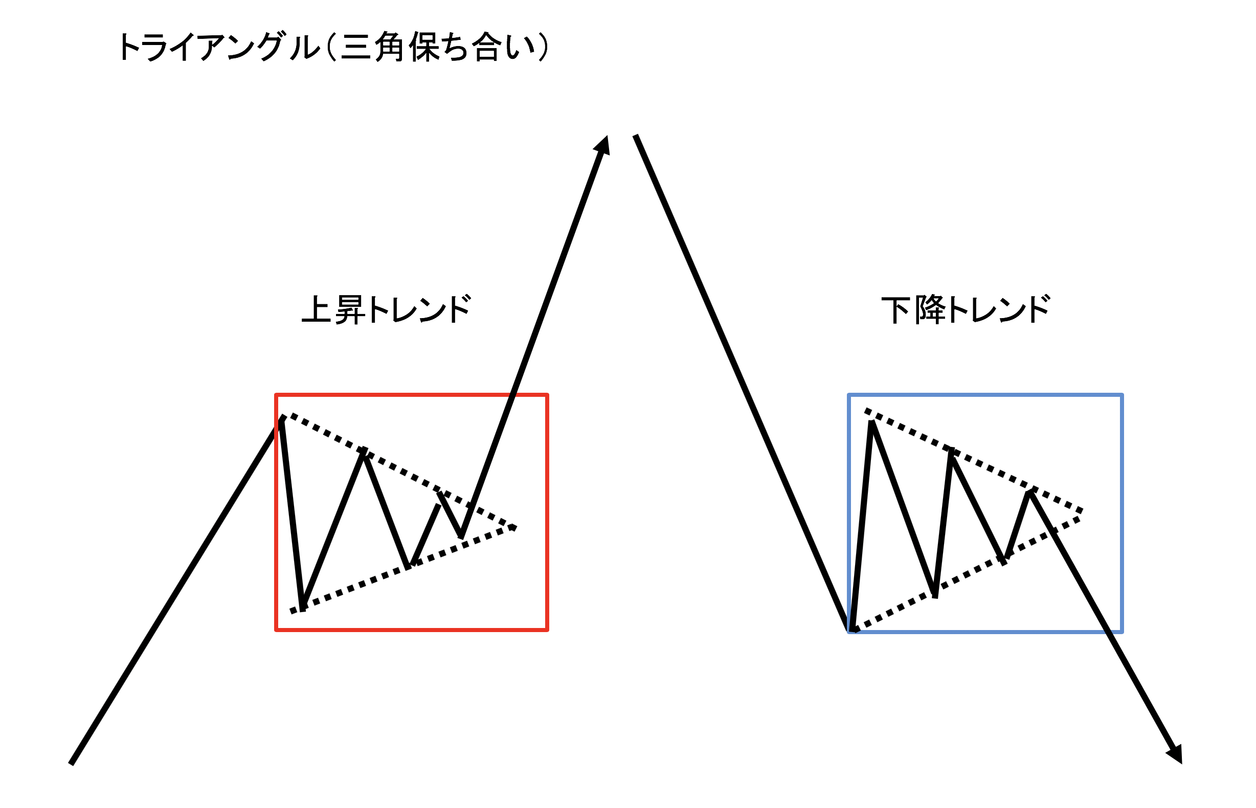トライアングル揉み合いのパターン。三角保ち合い。この間にボラティリティーが着実に減少する。 動画でも解説しています 用語解説01 「三角もちあい」 「三角持ち合い」「ペナント」「トライアングル」「P波動」などについて、チャートを交えて解説しています。