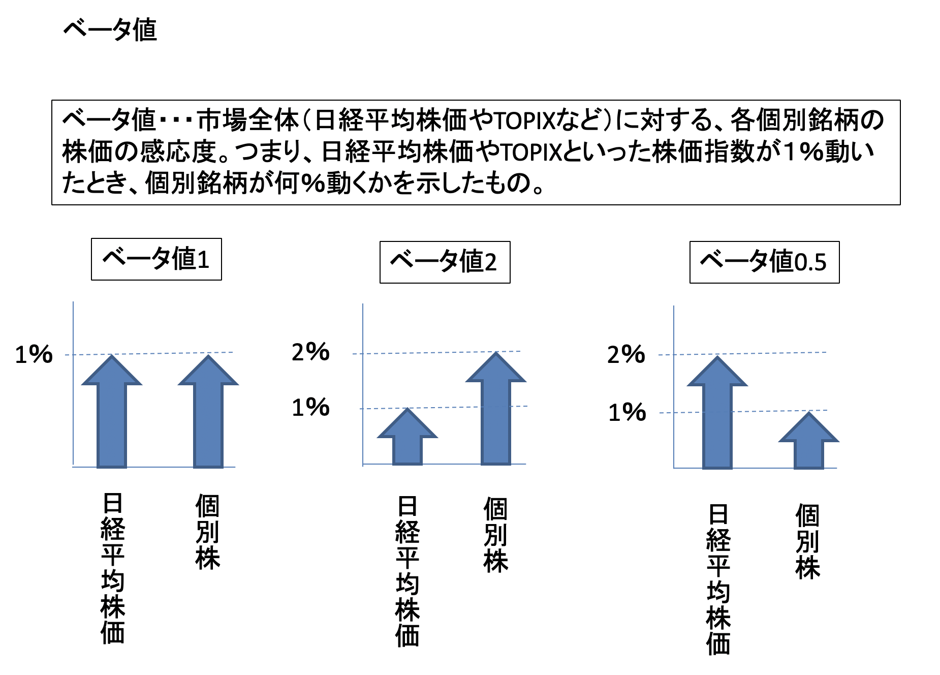 マーケットに対する銘柄の反応を表す数学的尺度。ベータが1.0の場合は中立の状態。2.0は銘柄が市場の2倍の動きを、0.5は半分の動きをすることを示す。