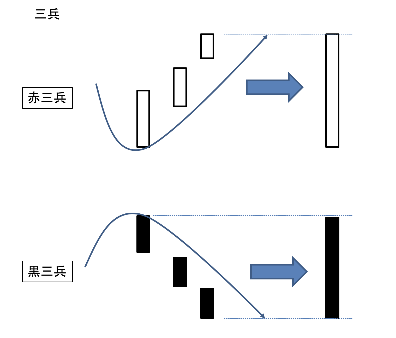 三兵 2017.11.25 さ 三兵陽線3本の並びを赤三兵。陰線3本の並びを黒三兵、もしくは三羽烏という。 この記事を読んだ方には次の記事もオススメです! 用語解説16 「三兵」 動画で三兵について解説しています!