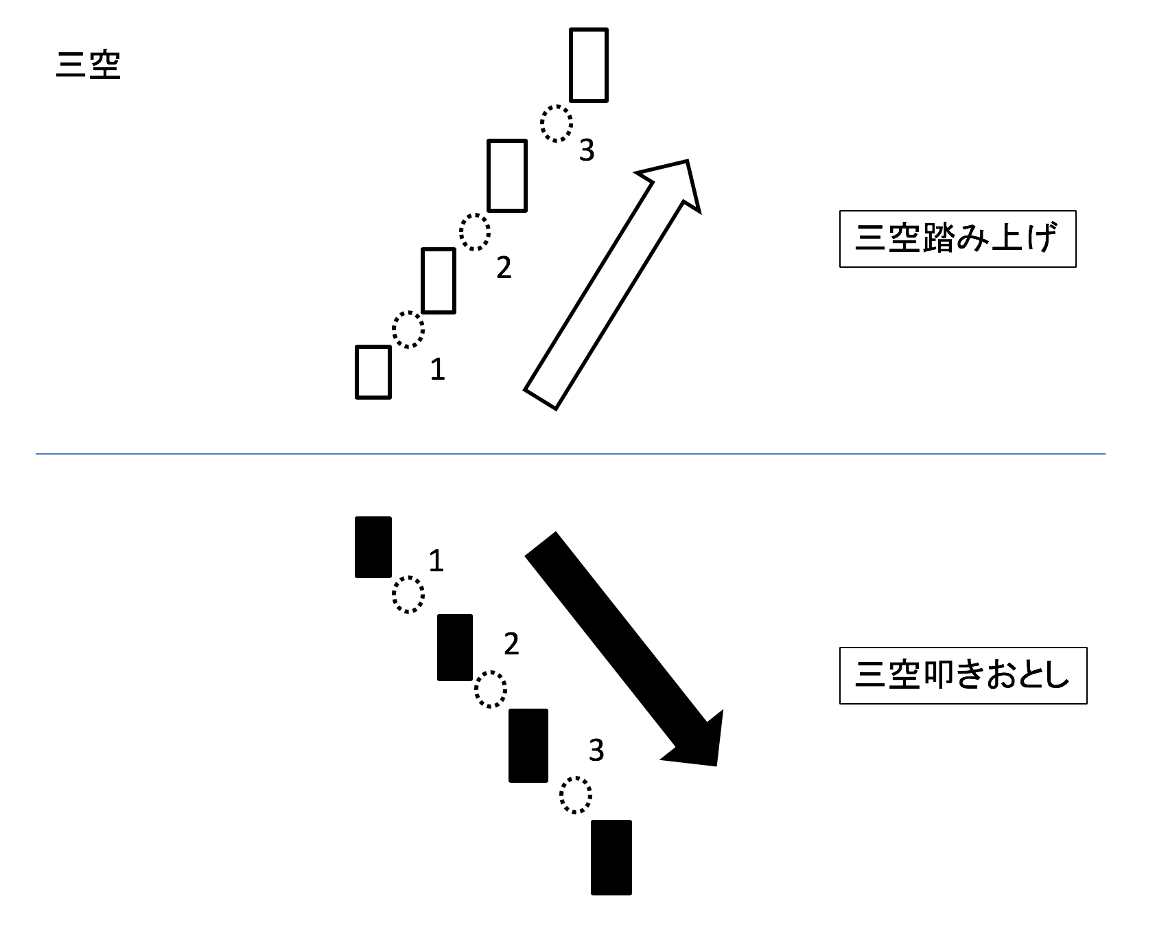 (さんくう)3本連続で窓(ギャップ)を開けて動くローソク足の組み合わせ。非常に強い場合は三空踏み上げ、非常に弱い場合は三空叩きおとしという。