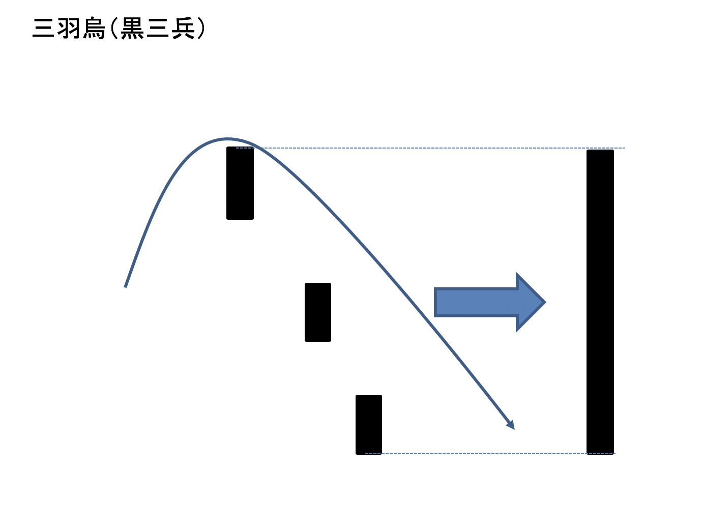 三羽烏 2017.11.25 さ 三羽烏(さんばがらす)上昇相場が続いた後の高値圏に、前日の引け値より下回った位置から陰線が3本続けて出現した状態。黒の三兵ともいう。売り圧力が強まっていると考えら今後も下落が続く可能性が高くなる。