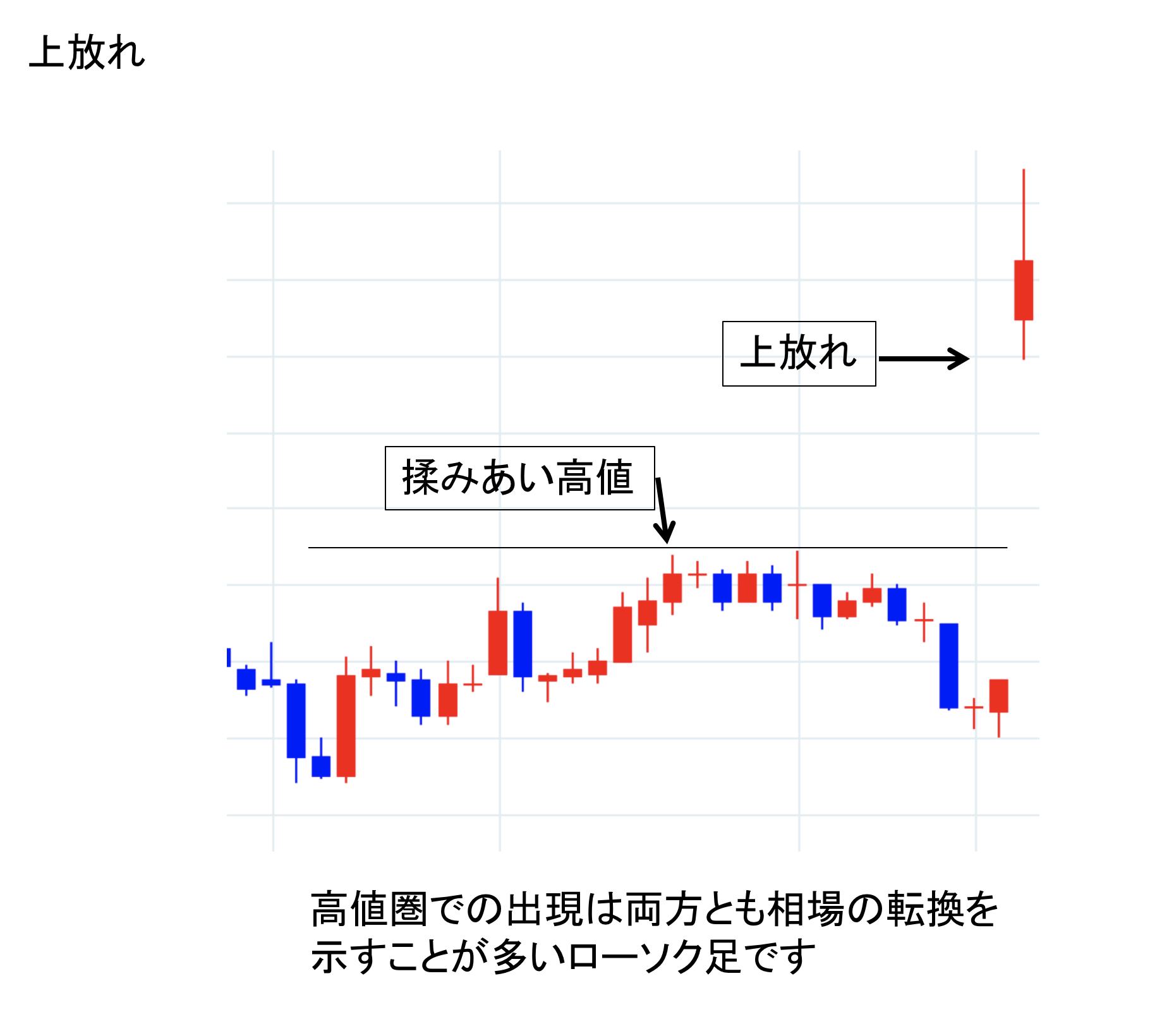 価格が揉み合いになった後、直近の高値を超えて上に抜けること。