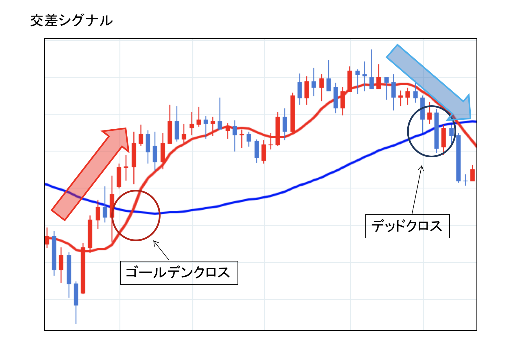 価格が境界線、代表的なものは移動平均線を横切るときにできるシグナル。ゴールデンクロス、デッドクロスなど。