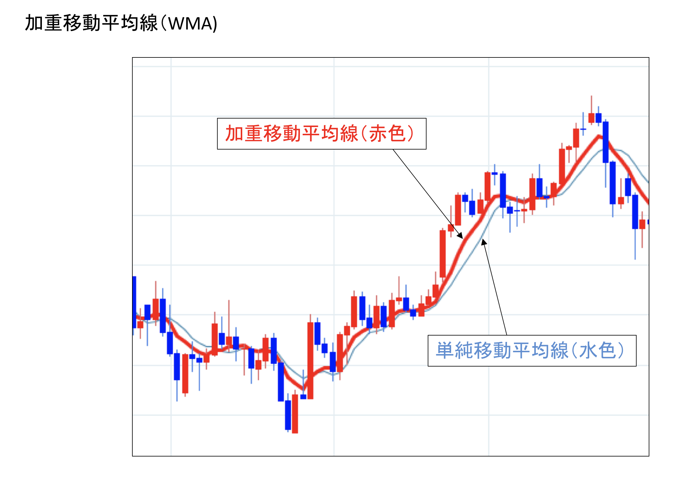 加重移動平均 2017.11.25 か 加重移動平均計算に使用する各日数に与えられた比重が異なる移動平均。代表的なものは、フロントウェイテッド移動平均で、計算上直近期間の数値がそれ以前の数値に比べて高い比重で扱われる。