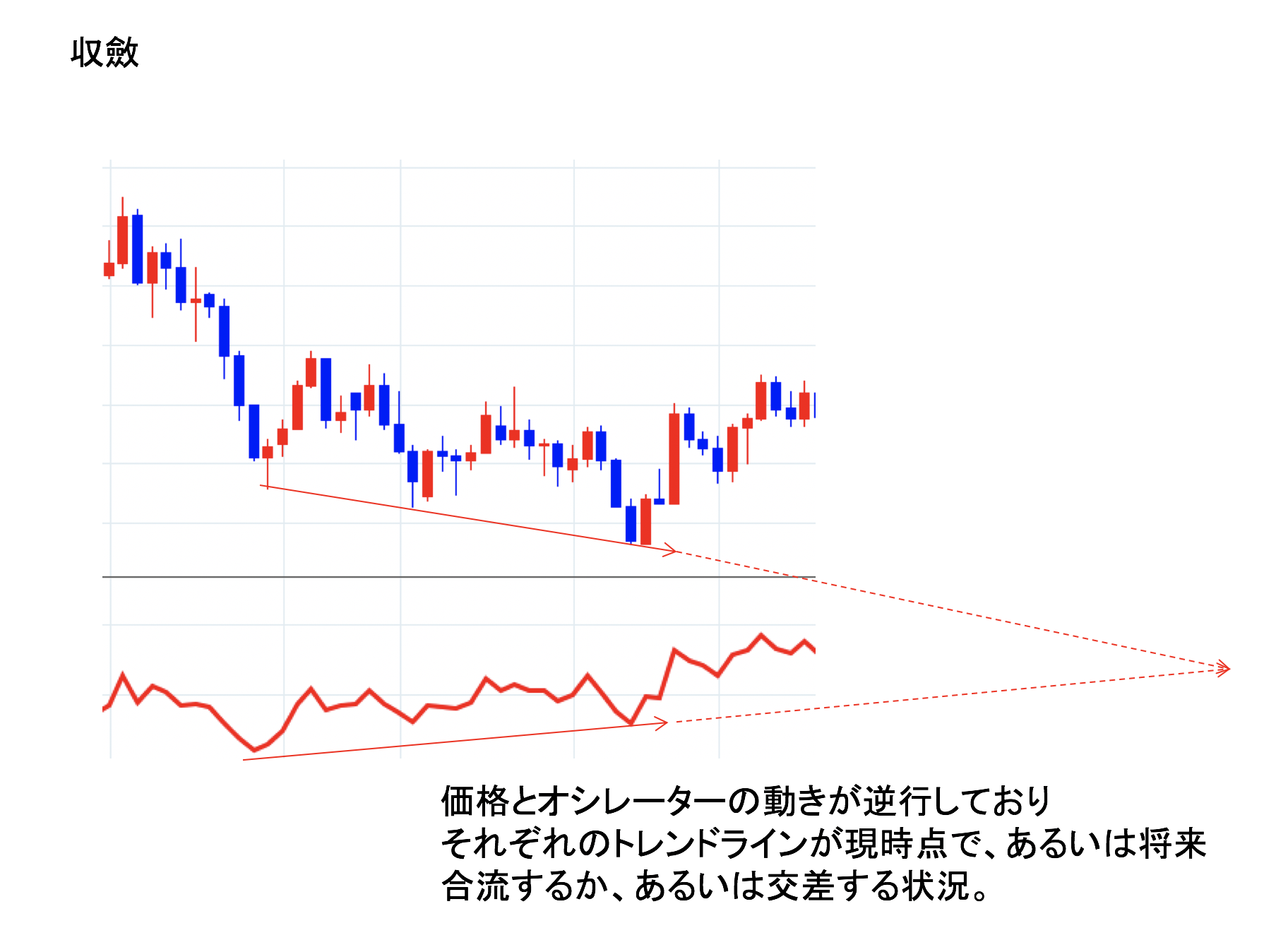 (コンバージェンス)トレンドラインが現時点で、あるいは将来合流するか、あるいは交差する状況。