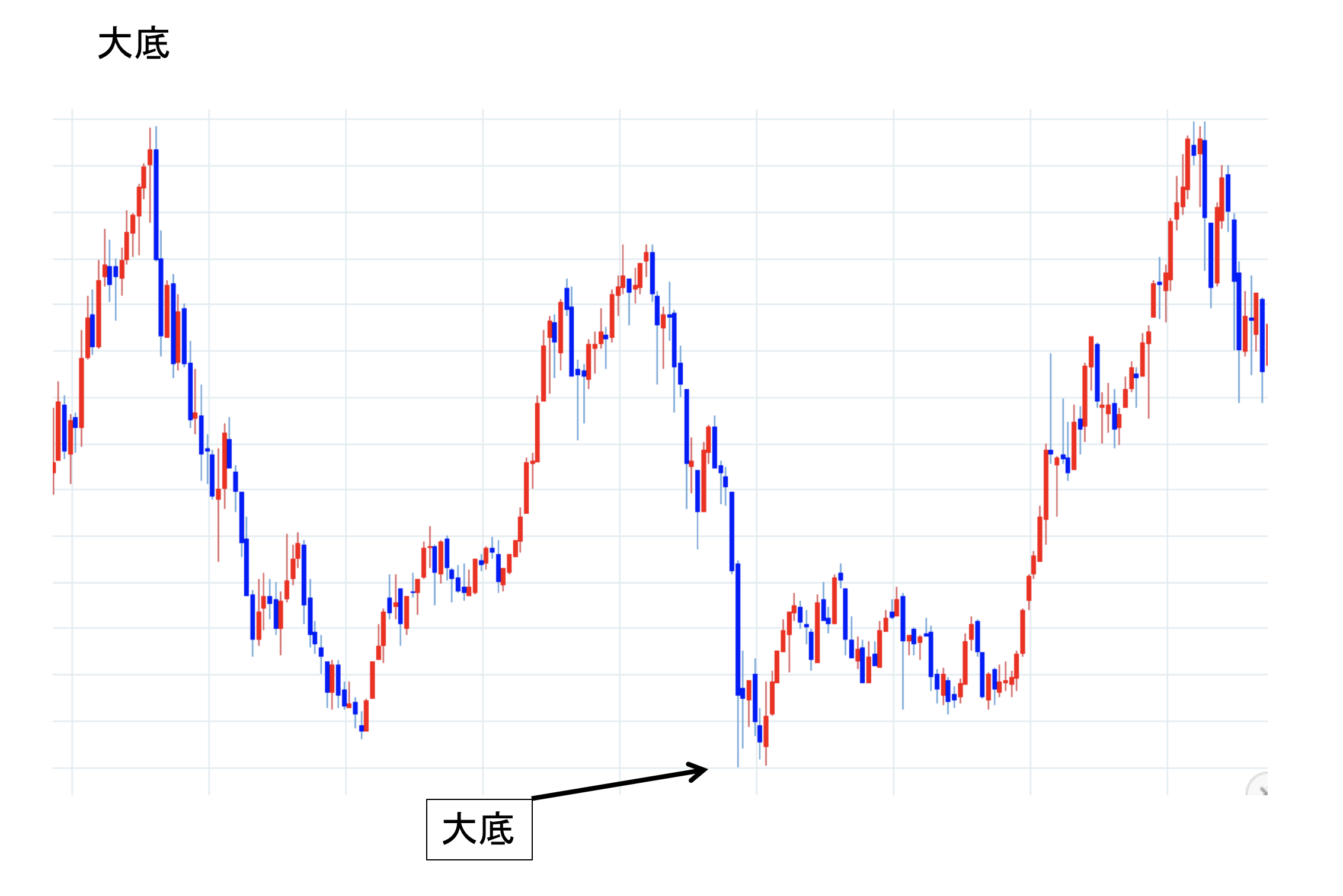 遡って長期の値動きを見た場合に幾つかの安い価格があるが、その中で一番低い底のところ。陰の極。