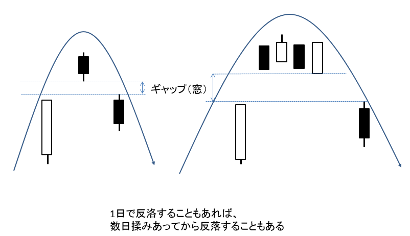 (アイランド・トップ)前日に陽線が出た後に、窓(マド)を空けてコマが現れ、更に窓を開けて陰線が出るローソク足の組み合わせ。三川宵の明星という。