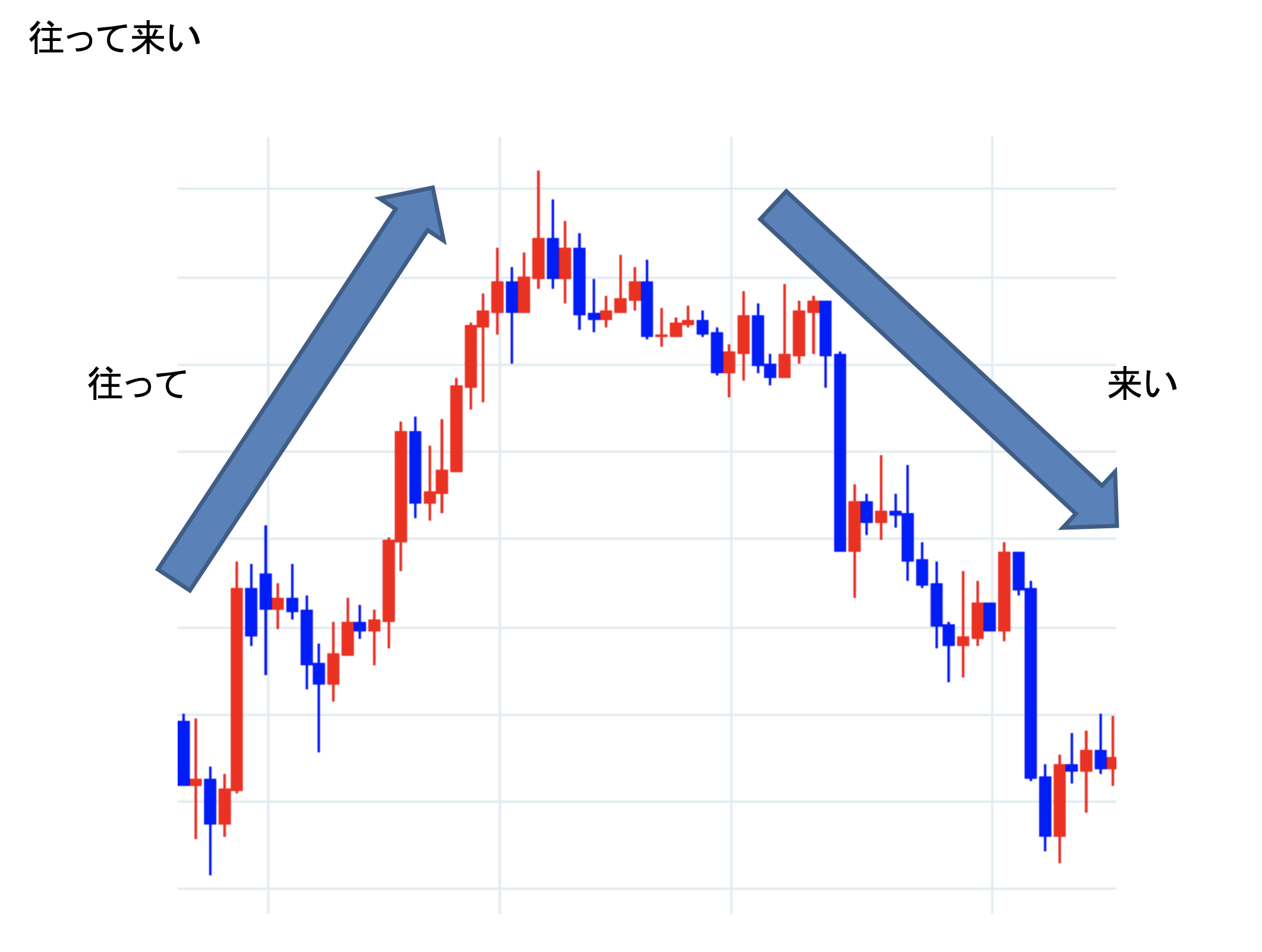 上昇していた銘柄が結局下がってきて、最初の価格に戻ってくること。