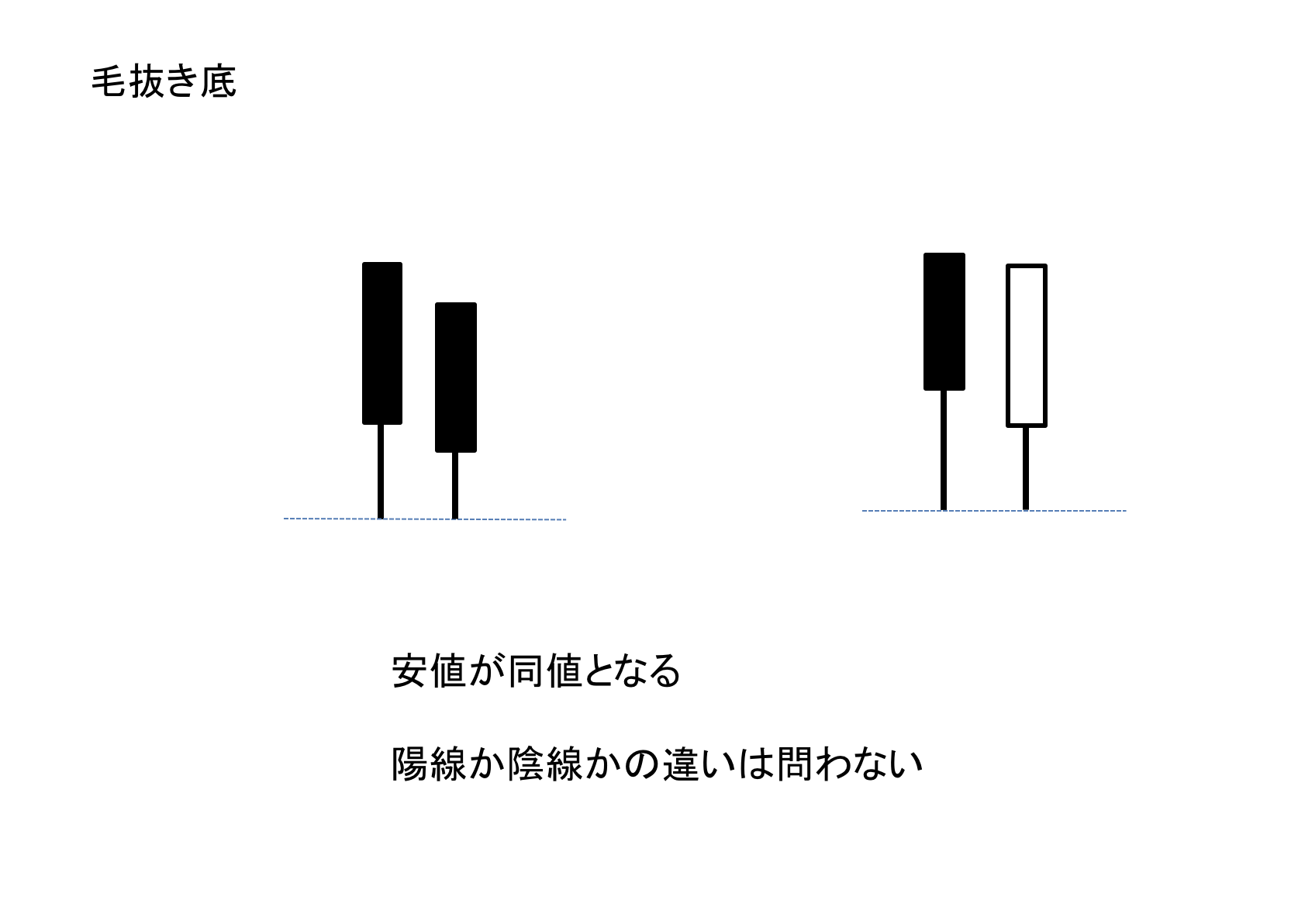 毛抜き底 2017.11.25 け 毛抜き底直近のローソク足の安値と当日のローソク足の底値が同値にあること。安値圏での出現が条件。 この記事を読んだ方には次の記事もオススメです! 用語解説20 「毛抜き」 動画で毛抜きについて解説しています!