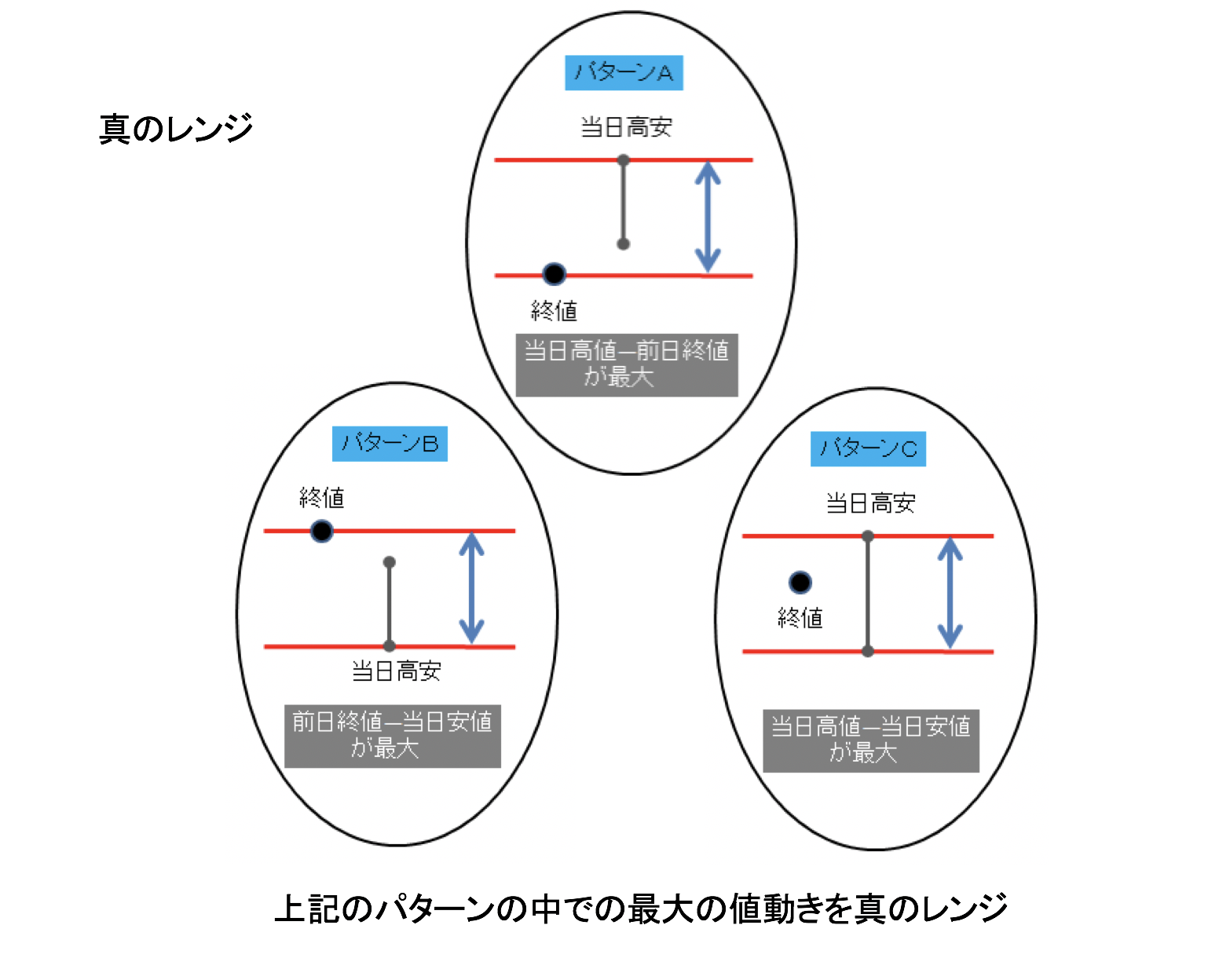 真の高値から真の安値を引いたもので、True range(トゥルーレンジ)
