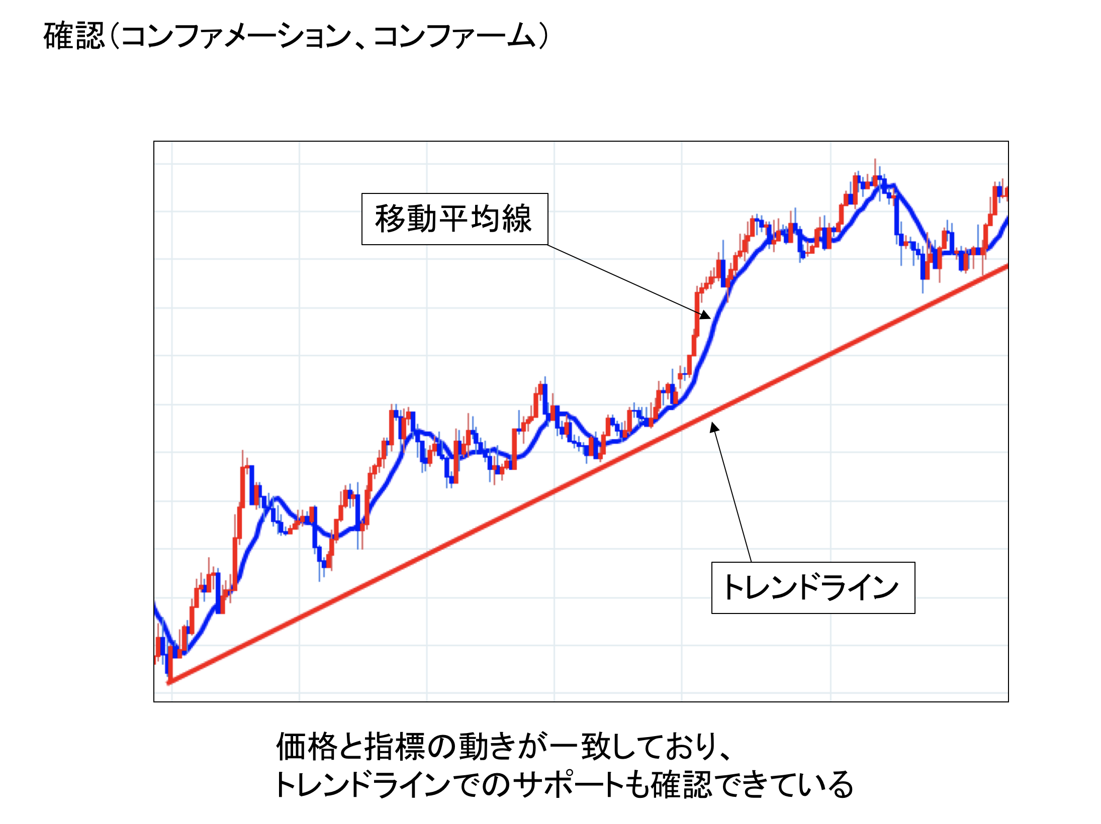 (コンファメーション)価格と指標が一致していて、そのために互いが確かめ合っているといわれるマーケットの状態。