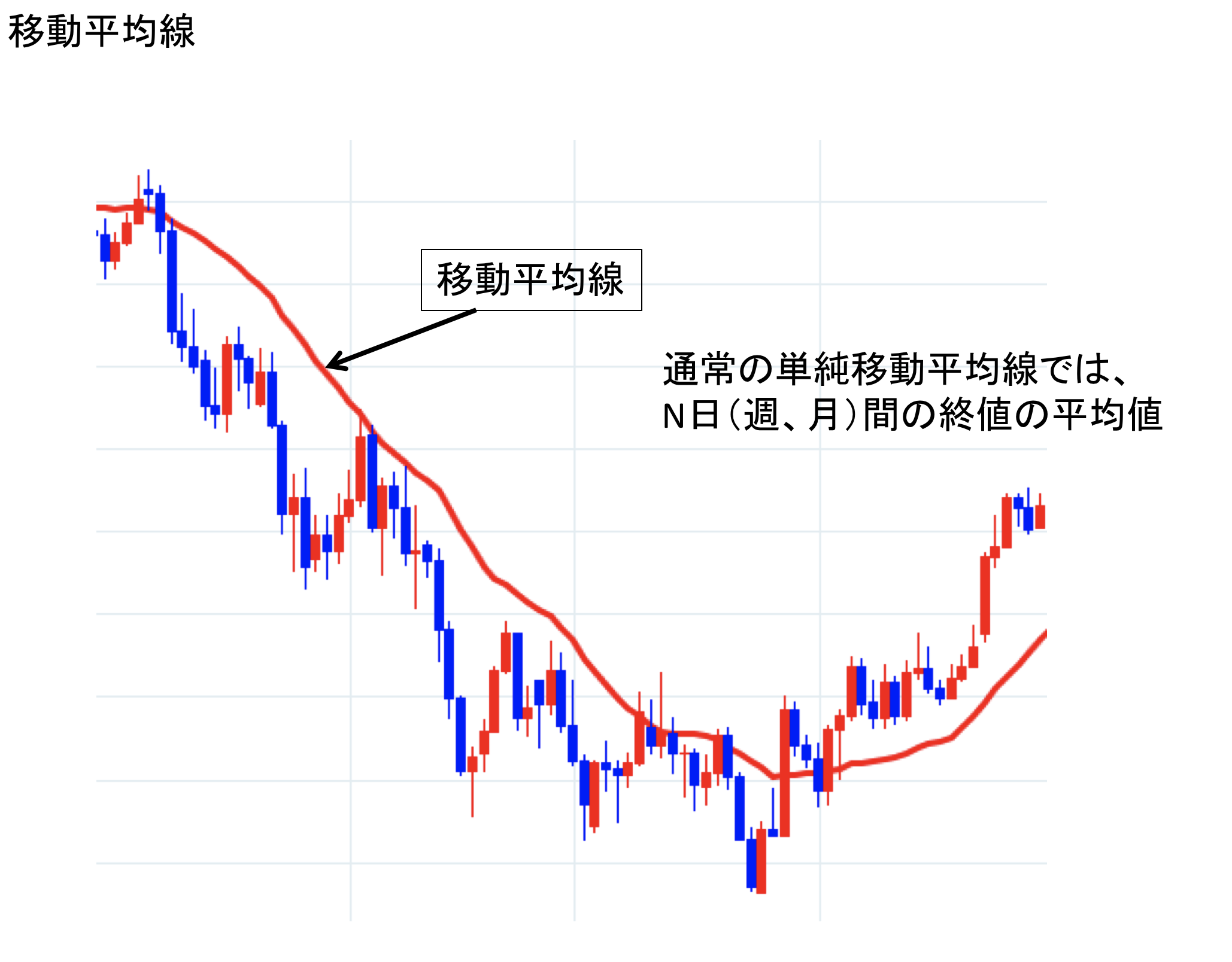 トレンド系のテクニカル分析の一つ。過去の一定期間の終値の平均をつないだ線。上昇・下降のトレンドを確認する。