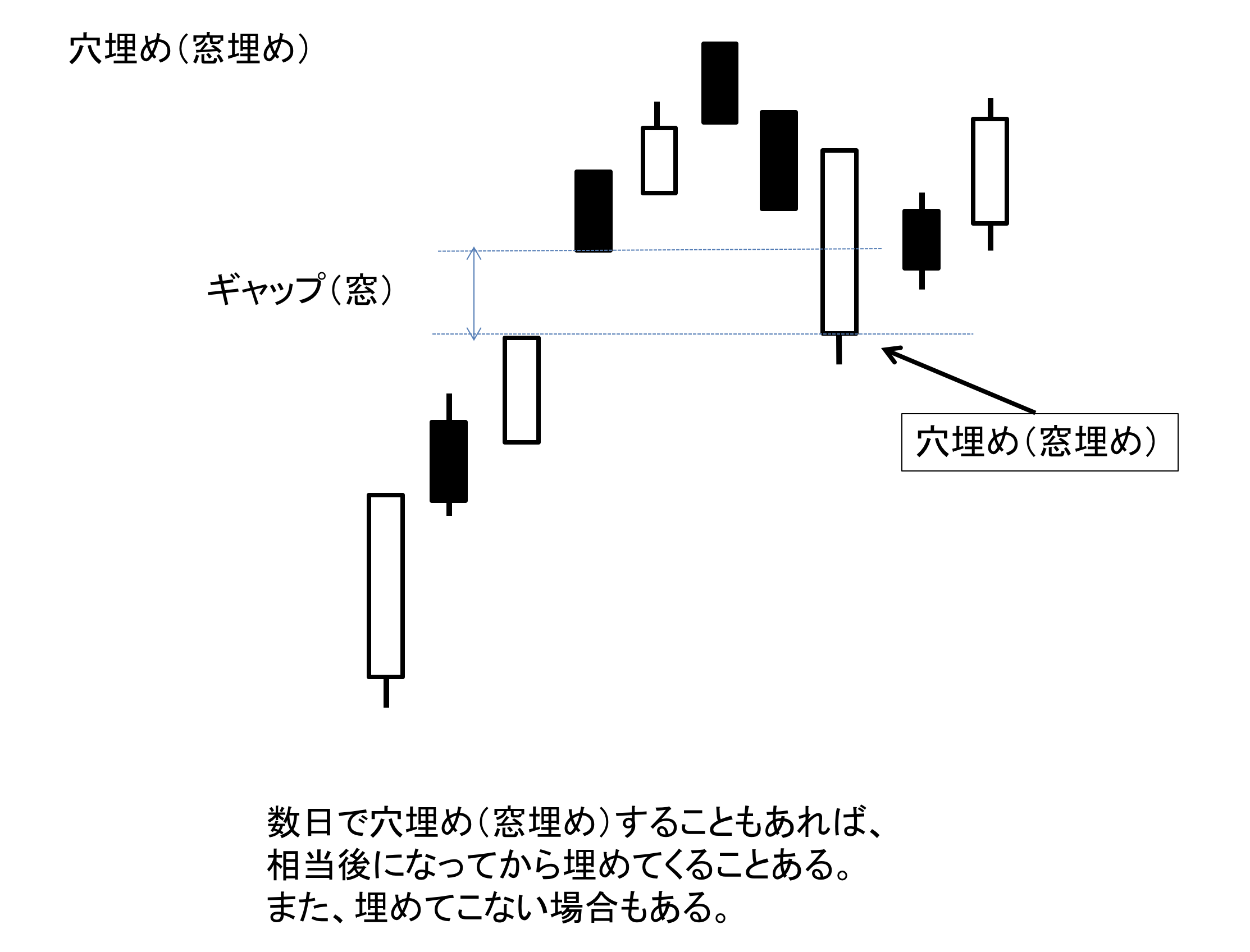 前日の罫線と当日の罫線で空間(空、窓、マド)を開けてから、その後の相場がその空間を埋めてくること。窓埋めともいう。