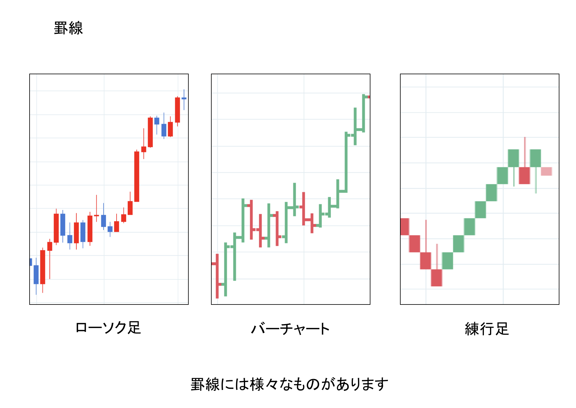 (けいせん)相場の動きをグラフ化したもの。チャートともいう。ローソク足や値幅足や三本抜新値足など幾種類もある。期間別には日足、週間足、月間足などがある。