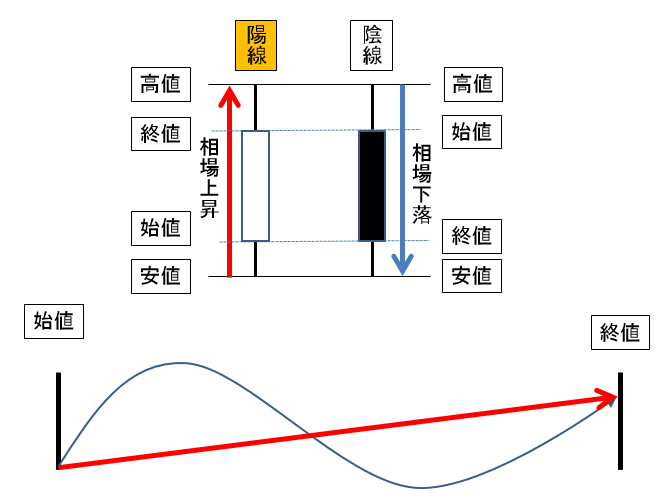 チャートにおけるローソク足において、始値から終値にかけて価格が高い状態。