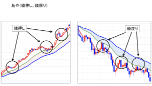 (あや)一時的な逆行現象。上げ相場における途上の小幅な下げを『綾押し』、下げ相場における途中の小幅の上げを『綾戻し』
