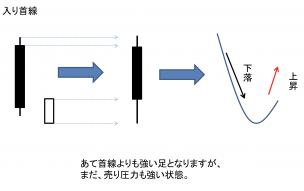 下落相場において前日の引け値より安く寄り付き、そこから前日の陰線の中ごろまで戻してきた陽線のこと。