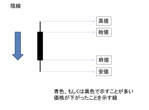 チャートにおけるローソク足において、始値から終値にかけて価格が安い状態。