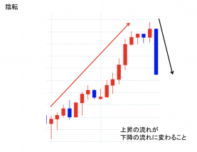 上昇の流れが下落の流れに変わること。三本抜新値足や平均足などで流れが変わった時。