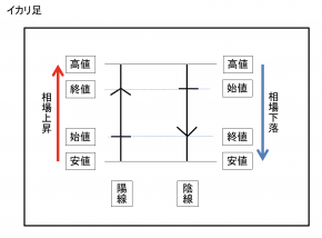 船の錨に似ていることが由来。棒線に始値と終値を足して、終値が高い場合は上向きのイカリに。終値が安い場合は下向きのイカリとなる。