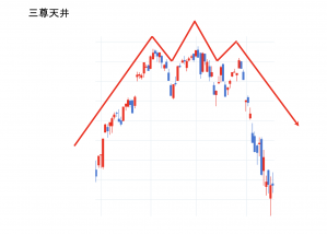 三山、トリプルトップ。ヘッドアンドショルダーともいい、チャート(グラフ)において三つの山を形成する天井圏で出てきやすい動き。人の上半身のように頭を中心として左右に肩が並ぶ形でネックラインを持つテクニカルチャートのフォーメ ・・・