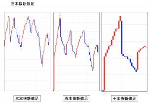 非時系列のテクニカル指標のひとつ。終値が高値を更新した場合には陽線、安値を更新した場合には陰線を記入。新値足の中でも、一般的によく使われるのが「新値3本足(三本抜新値足)」。終値が3本高値を更新した場合に陽線、その反対は ・・・