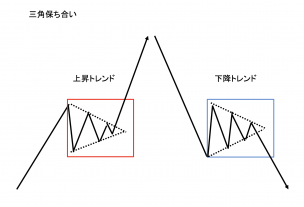上昇相場、下降相場の過程で上値抵抗線と下値支持線が接近し三角形のような形状になること。 動画でも解説しています