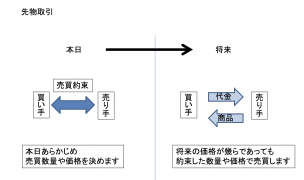 契約者がある商品を一定日時に一定価格で買うか、あるいは引き渡す義務を負う契約。通常先物を契約するときには、履行を保証するために証拠金が必要。