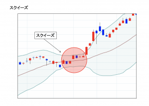 ボラティリティーが収縮した時期で、ボラティリティーの増大時期の先駆けとなる。