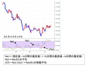オシレーター系のテクニカル指標。現在の価格が直近のn日の取引値幅のどの位置するかをパーセンテージで示すもの。