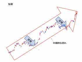 中期的な動きの範囲での価格変動によって決められるタイムフレーム。中期的な上昇トレンドを修正するのは短期的な下落トレンドである。