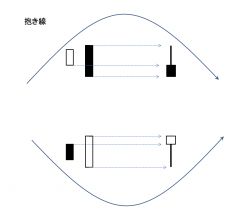 (包み線)前日の陰線、もしくは陽線を、当日のローソク足の値幅で完全に包む大陽線または大陰線のローソク足の組み合わせ。