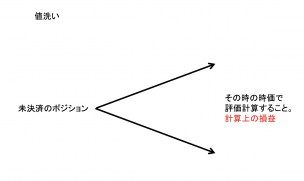 未決済のポジション建玉を、その時の時価で評価計算すること。計算上の損益。