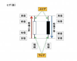 影ともいう。ローソク足の実体(始値から終値)に対して高値や安値の細線の部分。高値のヒゲを上ヒゲ、安値のヒゲを下ヒゲ。