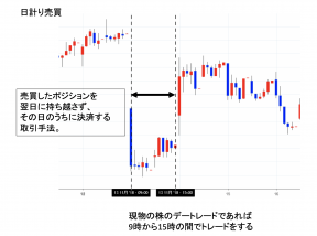 デイトレード。売買したポジションを翌日に持ち越さず、その日のうちに決済する取引手法。